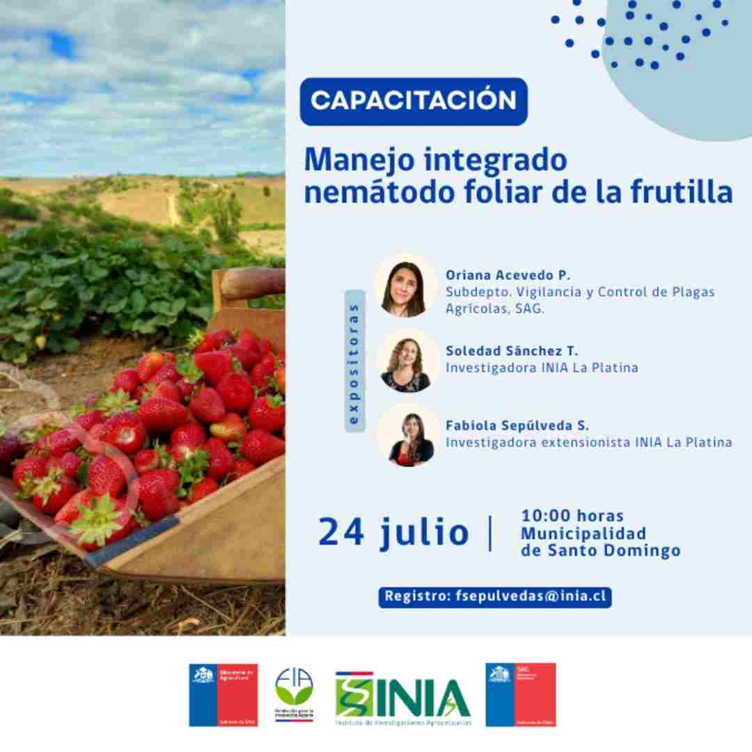 Santiago, julio de 2025.- Frente a los desafíos que presenta el nemátodo foliar en el cultivo de la frutilla en Chile, la Fundación para la Innovación Agraria (FIA), el Servicio Agrícola y Ganadero (SAG) y el Centro Regional de Investigación INIA La Platina realizarán la capacitación “Manejo sustentable de la frutilla: Avances y desafíos en el manejo de Aphelenchoides fragariae”, dirigida a agricultores, asesores y profesionales del agro.