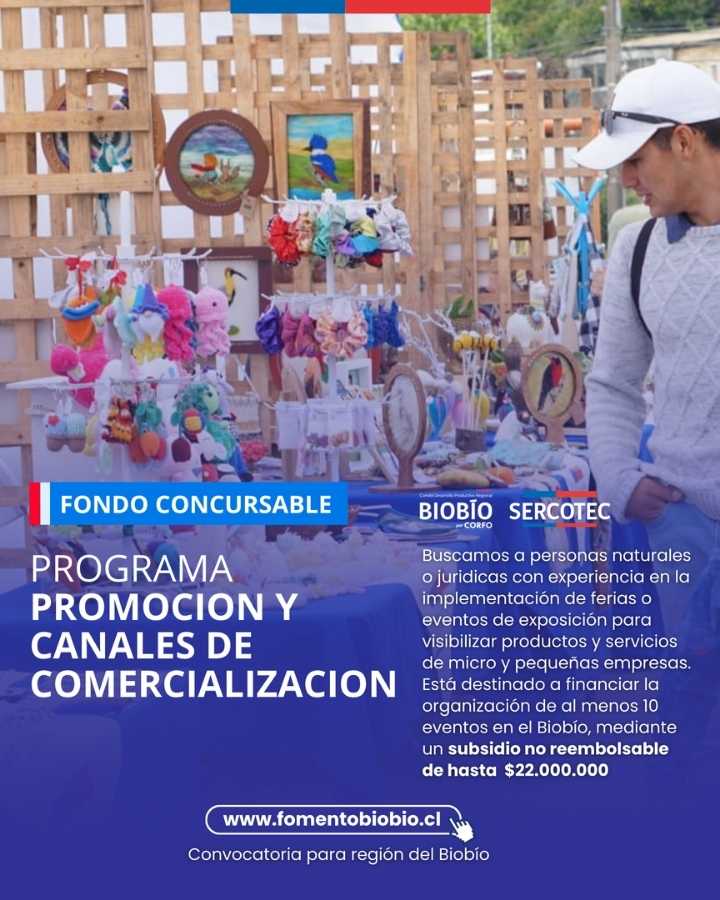 El primero es el Programa Promoción y Canales de Comercialización, que financiará la organización de al menos 10 ferias o eventos de exposición en el Biobío, con el objetivo de visibilizar productos y servicios de emprendedores locales. Este fondo considera un subsidio no reembolsable de hasta $22 millones para las personas naturales o jurídicas con experiencia en organización de eventos para micro y pequeñas empresas. La postulación estará abierta hasta el 17 de septiembre, a las 18:00 horas.