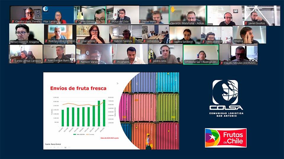 San Antonio, 30 de octubre de 2025 — La Comunidad Logística de San Antonio (COLSA) en coordinación con Frutas de Chile, convocó a los actores clave de la cadena, incluyendo a, EPSA, los terminales (STI y DP World), navieras, depósitos y servicios fiscalizadores, en una reunión de planificación estratégica crucial. El objetivo es maximizar la eficiencia y la colaboración para enfrentar la temporada alta de exportación de fruta 2025-2026, reafirmando que COLSA genera conexiones que impulsan el desarrollo país.