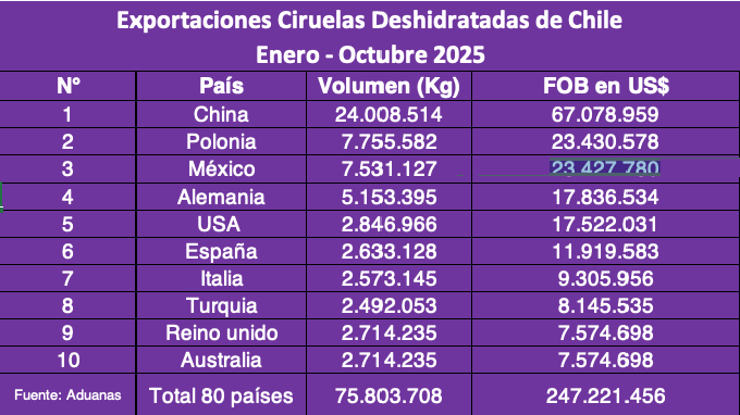 En los primeros 10 meses de 2025 las exportaciones chilenas de ciruela deshidratada llegaron a 75.800 toneladas métricas (TM), equivalentes a US$ 247,2 millones.