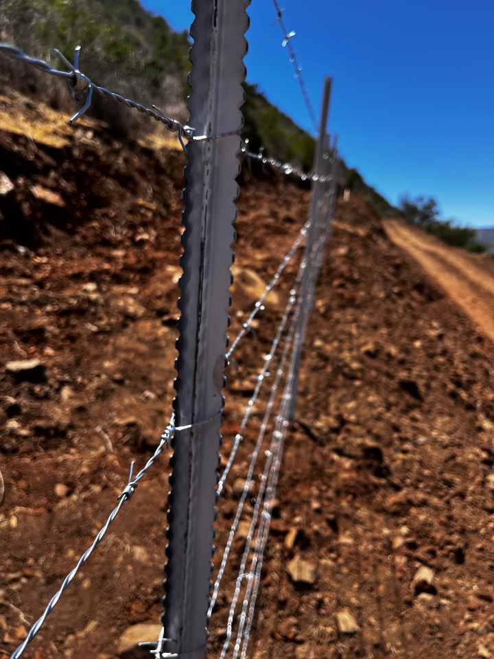 El objetivo era cerrar 2,9 kilómetros de perímetro, tarea que, con postes de madera, habría requerido excavar cientos de hoyos, aumentando el tiempo, el esfuerzo y el uso de maquinaria. En cambio, el cliente optó por una metodología más ágil: utilizar un rotomartillo con broca de 40 cm para realizar una guía inicial, lo que permitió luego clavar fácilmente los Postes AZA, incluso en suelos duros.