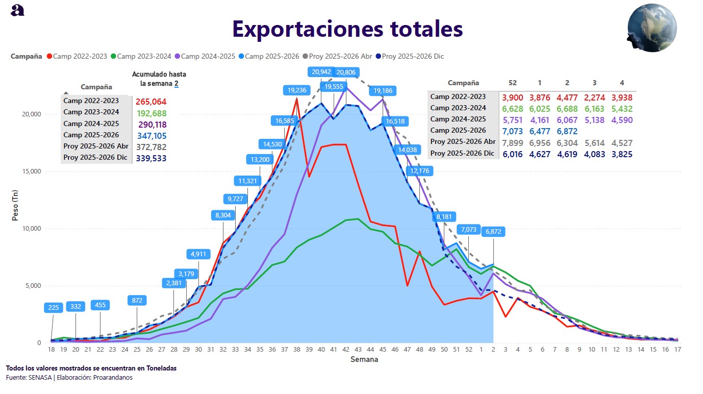 El arándano peruano acumula 347.105 toneladas a la semana 2, con un desempeño 19% superior frente a la campaña 2024/25. En la semana 2 se registraron 6.872 toneladas, dato que permite seguir el pulso del envío semanal en el inicio del año.