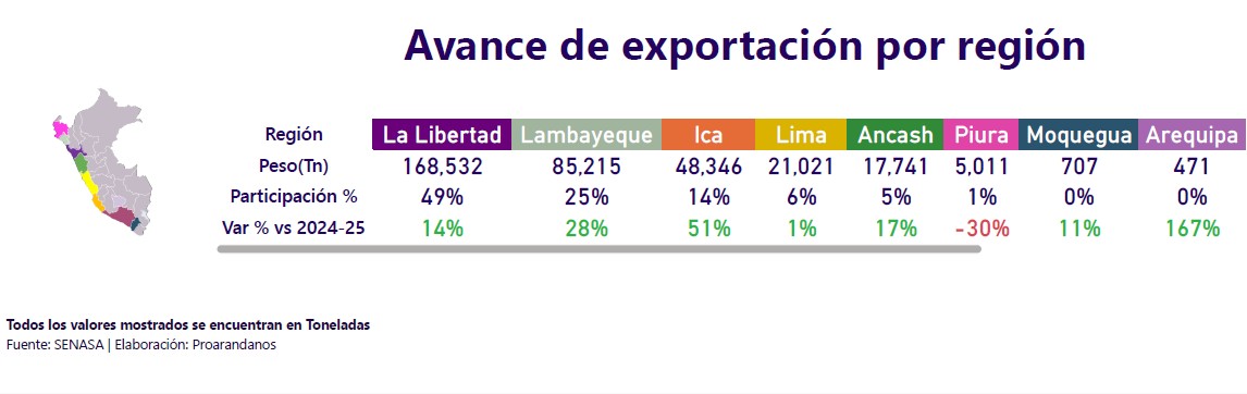 El reporte incluye además la variación por región frente a la campaña anterior. Ica destaca con un aumento de 51%, Lambayeque crece 28% y La Libertad 14%, mientras Piura muestra una caída de 30%. Esta distribución permite entender dónde se concentra la oferta del arándano y cómo se reequilibra el aporte regional en la temporada.